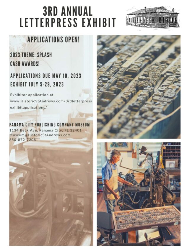 The Historic St. Andrews Waterfront Partnership is hosting the 3rd Annual Letterpress Art exhibit at the Panama City Publishing Company Museum. The 2023 exhibit theme is “Splash.” Letterpress artists are invited to download the prospectus and application for more information on the juried exhibit to apply. Applications and a digital photo of each submission are due by…