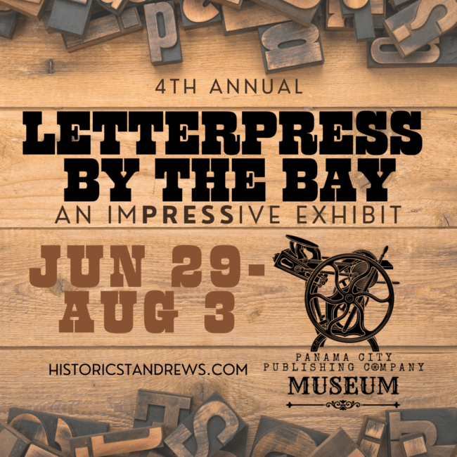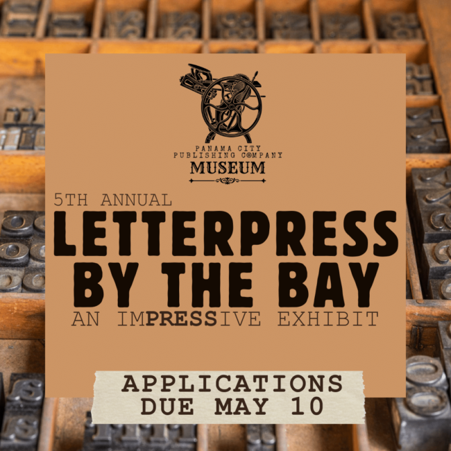 The Historic St. Andrews Waterfront Partnership (HSAWP), the managing organization of the Panama City Publishing Company Museum (PCPCM), will host its 5th annual juried exhibition to showcase creativity with letterpress printing techniques. From this craft, we strive to challenge and inspire artists and historians to continue the love of printing. SCHEDULE January Call for entries.May…